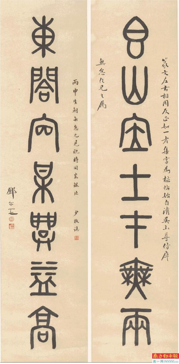 邓尔雅特展展出的楹联“香山居士才无两,东阁官梅兴益高”。此为正反体楹联(又称“玻璃体”)。这种楹联,字体结构左右对称,左右、正反两面均如一,极尽平正对称之能事,同时还要集成楹联,对仗工整。此联充分体现了邓尔雅博闻强记,在传统文学、文字学等方面素养深厚。