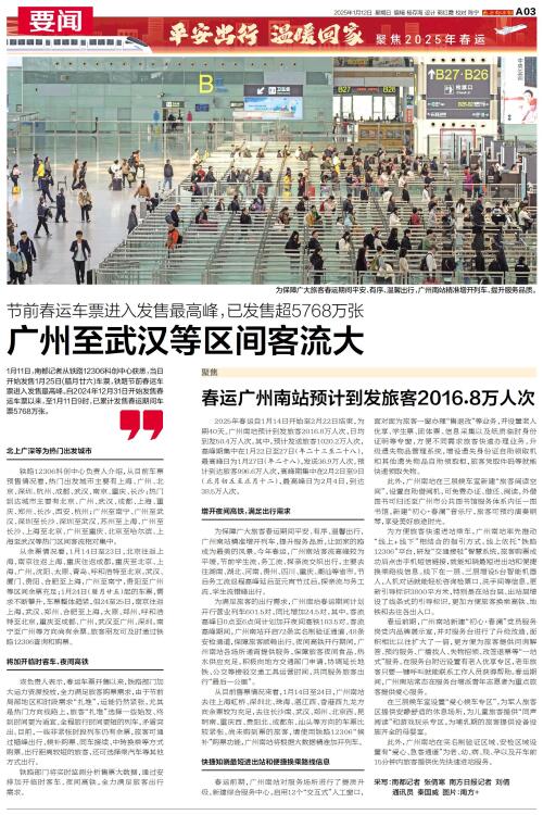1月11日,南都记者从铁路12306科创中心获悉,当日开始发售1月25日(腊月廿六)车票,铁路节前春运车票进入发售最高峰。