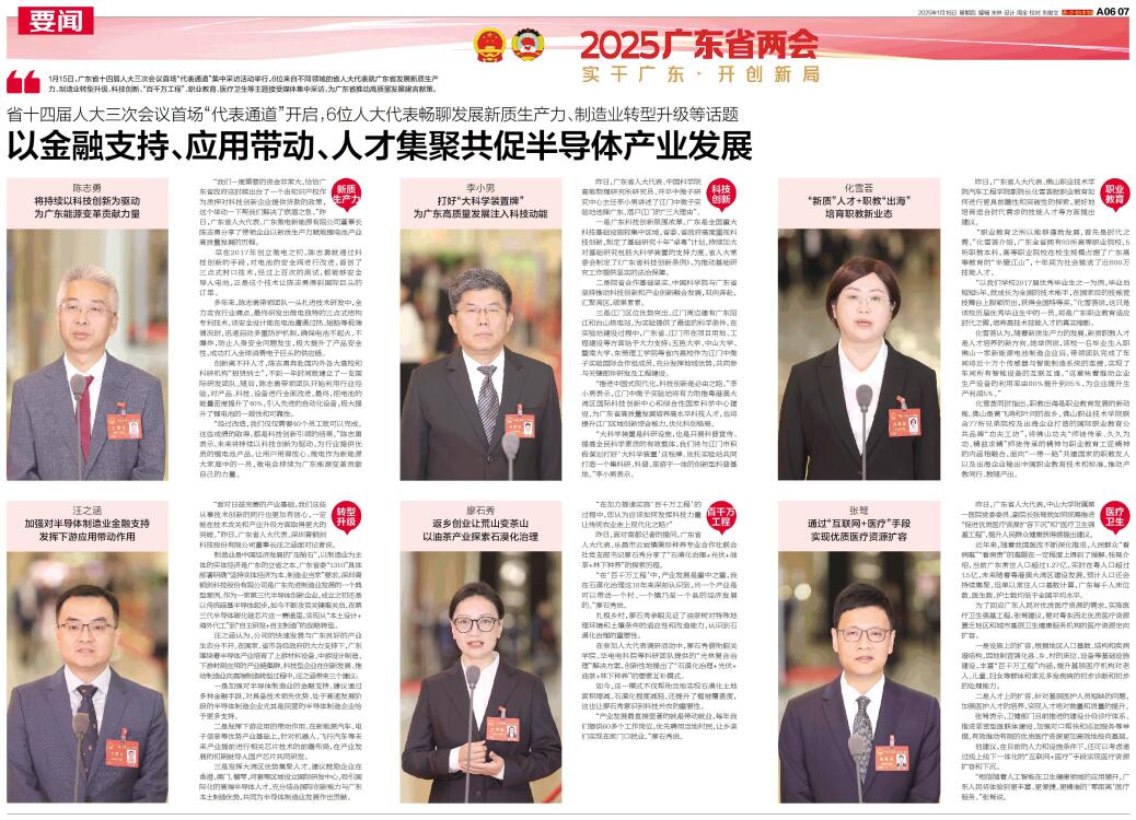 6位来自不同领域的省人大代表就广东省发展新质生产力、制造业转型升级、科技创新、“百千万工程”、职业教育、医疗卫生等主题接受媒体集中采访,为广东省推动高质量发展建言献策。