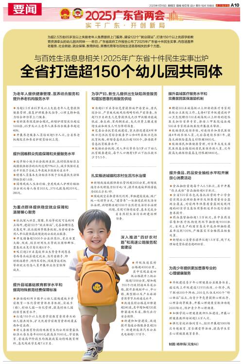 为超2.5万名65岁及以上失能老年人免费提供上门服务、建设122个“就业驿站”、打造150个以上优质学前教育资源牵头的幼儿园共同体……昨日,广东省政府工作报告公布了2025年广东省十