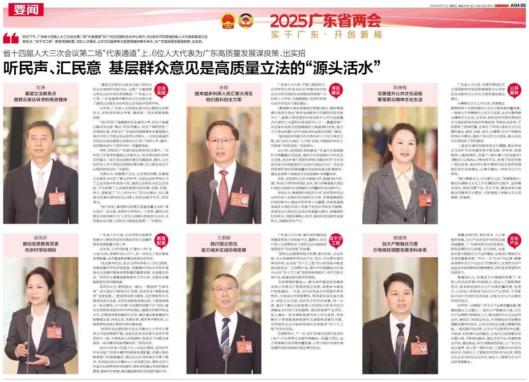 6位来自不同领域的省人大代表就基层立法联系点、“百千万工程”、教育资源配置、湾区人才建设、公共文化服务等主题接受媒体集中采访,为广东高质量发展谋良策、出实招。