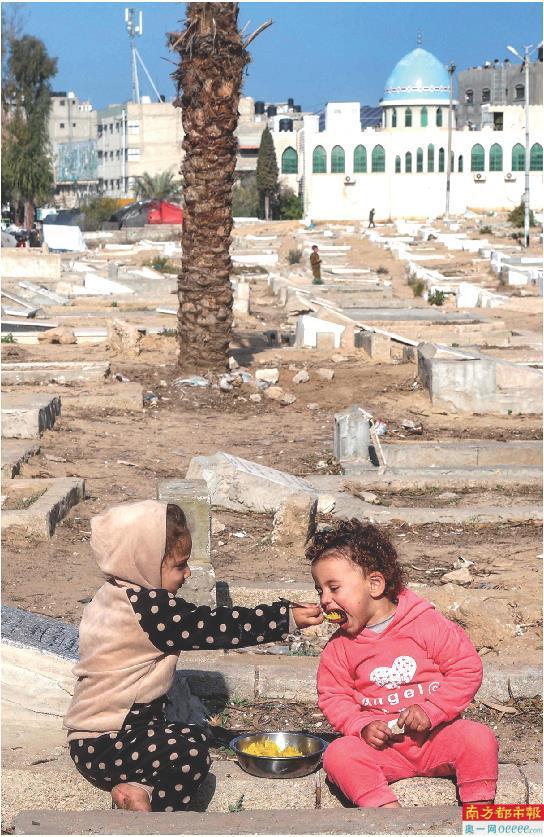 1月12日,加沙地带一名小女孩给另一名儿童喂食。