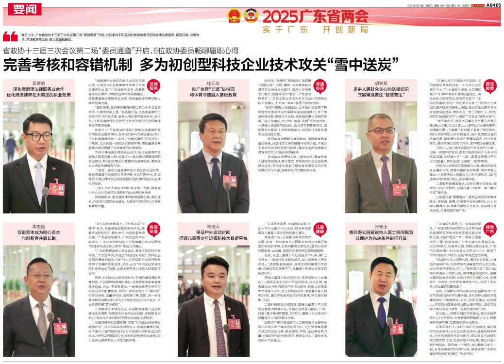 昨日上午,广东省政协十三届三次会议第二场“委员通道”开启。六位来自不同界别的省政协委员围绕港澳法律服务、投资环境、非遗传承、普法教育等话题,提出意见和建议。