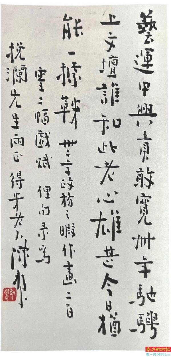 陈树人的书法可谓独具面目。“他的书法崇尚淑气,下笔线条有意避开莽夫习气,讲求儒雅脱俗之风。他经常故意削减笔画,以求得方圆意趣与简约之美。”黎丽娜表示,所谓书如其人,陈树人的书法写得如同他那般高大清瘦,尤重整篇的韵律,每字用笔含蓄内敛。“广东省博物馆藏的行书《艺运中兴诗》提到‘艺运中兴责敢宽,卌年驰骋上文坛。谁知此老心雄甚,今日犹能一据鞍。’这是陈树人晚年对自己一生的总结,正好也符合我们对他一生的总结。”