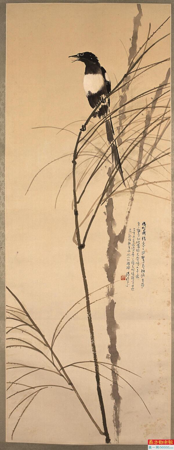 “他写红棉,能尽量地发挥他的朱,能反映出中国的民族性的伟大和岭海的雄风。”这是高剑父对陈树人的红棉的赞誉之辞,但让南都记者印象更为深刻的却是他对陈氏写竹和柳条的评价:“他写竹和柳条,都是一笔五六尺长,大刀阔斧一扫便了,却觉得生气拂拂,从指溢出来的。这是有把握、有决断的、斩钉截铁底技法,而又带着天真平淡,不食人间烟火,幽清秀骨,思在天外的独到。”果不其然,陈树人笔下的柳,很多都是一笔而过,一气呵成的长长的柳枝从画的顶部一笔拖到底部,形成完美的空间,画面大幅的留白,简洁而不简单,空灵而不空洞,很有视觉冲击力。《白门杨柳》(广州艺术博物院藏)是陈树人1938年的创作,这一年是抗战进入第二年,陈树人面对江山破碎,感慨良多,画上的喜鹊似在呐喊。黎丽娜表示,陈树人也自诩杨柳、竹子、芦苇是自己的代表作,因为这些作品都是在五六尺的宣纸上,一笔写下来不停顿不重复是最见功力的。