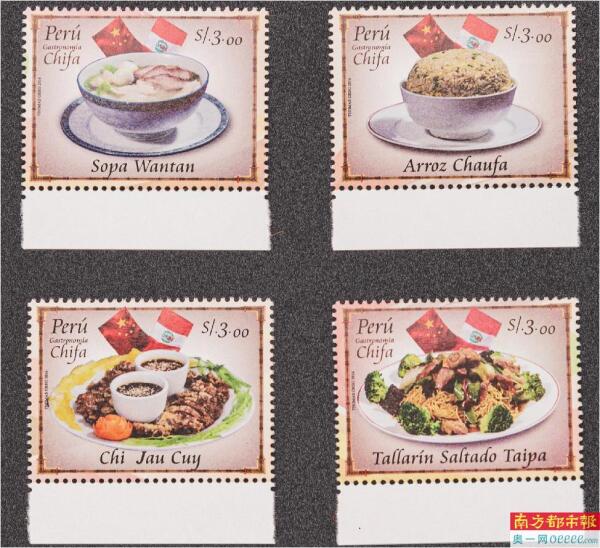 这套CHIFA邮票图案选择了秘鲁人最喜爱、家喻户晓的四道著名中餐:炒米饭、馄饨、八珍炒面、柱侯鸡。四道中餐最初都是广东人带来的,所以名称是粤语与西班牙语的结合,如同秘鲁的中餐与本地人口味完美结合,受到当地人喜爱,又被人们戏称为“本土中餐”。不过邮票上有个小插曲,柱候鸡的“鸡”单词拼写成了“豚鼠”。
