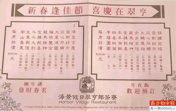 现代美国蒙特利公园市海景假日翠亨邨茶寮菜单(广州华侨博物馆藏)