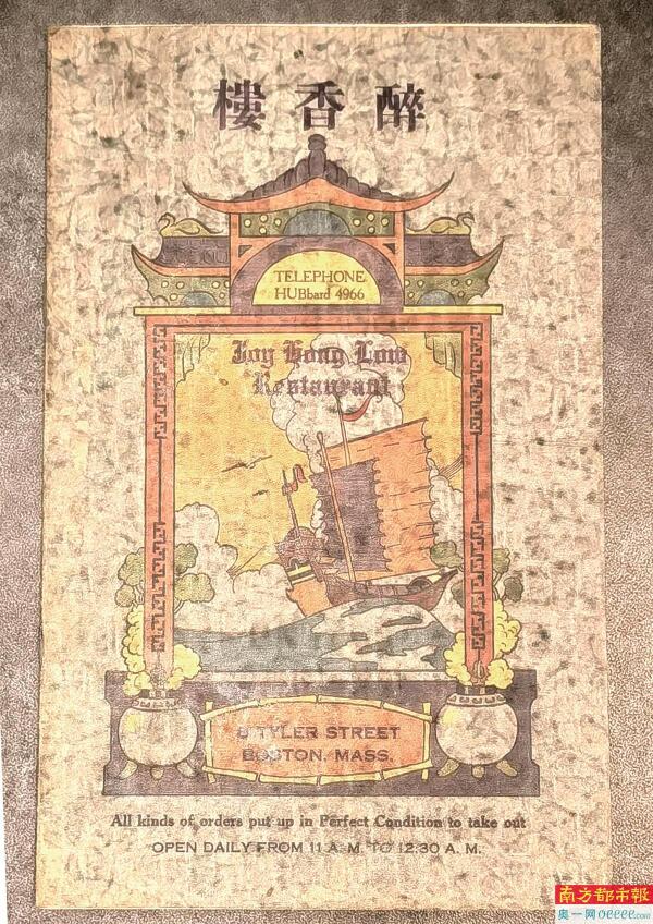 醉香楼是民国时期广东华侨在美国波士顿开设的粤菜馆,以广式炒龙虾为特色菜,曾接待过赵元任、吴宓、陈寅恪、钱昌祚、徐志摩、胡适等多位中国知名学者。该餐馆的菜单封面印有中国古代楼阁式建筑图案,展现了菜单不仅是餐馆与食客信息传递的媒介,也是以广东华侨华人为代表的众多海外侨胞乡愁的寄托。