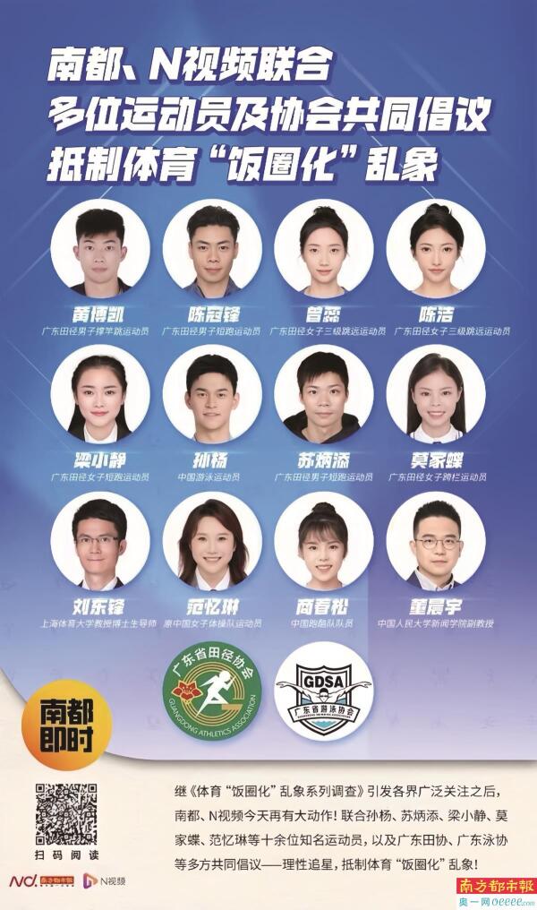 扭转体育“饭圈”不良风气,需要社会各界的共同努力。南都、N视频联合孙杨、苏炳添、梁小静、林跃、范忆琳、商春松等知名运动员,以及广东省田径协会、广东省游泳协会等多方发起倡议,共同抵制体育“饭圈化”乱象。