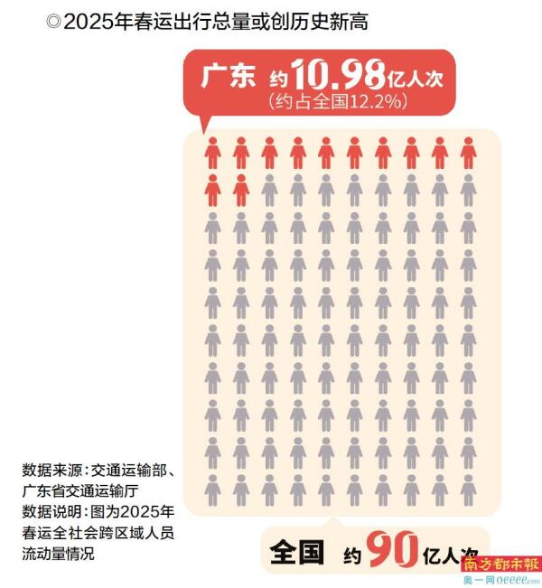 作为人类历史上规模最大的、周期性的人类大迁徙,春运甚至入选了世界纪录协会世界上最大的周期性运输高峰。今年春运有多少人出行?据交通运输等部门预计,2025年春运全社会跨区域人员流动将达到90亿人次,铁路、民航客运量有望分别突破5.1亿人次和9000万人次,均创历史新高。具体到广东省,初步预计2025年春运广东省全社会跨区域出行人员流动量约10.98亿人次,约占全国12.2%,同比增长4%。预计春运期间广东省跨区域人员流动量、铁路客运量、民航客运量有望创新高。