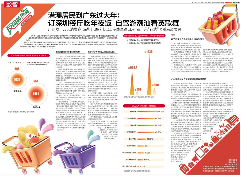 广东正是通过不断提升消费环境、服务质量,如丰富消费选择、完善跨境支付、推出专属消费福利等方式,更好地抓住港澳游客北上消费这波“流量”。叠加广东各地在春节期间推出的各具特色的文旅活动,使港澳居民北上“吃喝逛买”分外热闹。