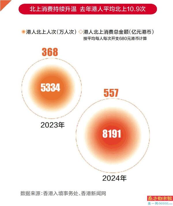 按香港特区政府统计处早年的资料,香港居民到广东省旅行扣除跨界的交通费用后,平均每次的消费开支约为680元,以此估算,2024年港人北上消费的总金额近557亿元,较2023年多花近200亿元。香港特区立法会议员张欣宇认为,港人北上不仅仅是阶段性的热度,而已成为香港人生活方式的一种常态。