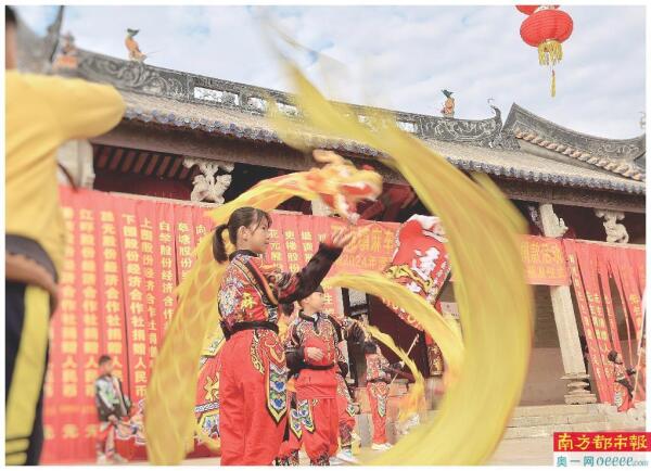 ②广州增城石滩镇麻车村进行舞龙舞狮表演。