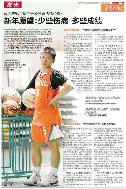 此前,张家城在受访时称,希望能考个好大学,在大学篮球场上,“继续打我的篮球,继续去热爱篮球”。农历春节前夕,他告诉南都、N视频记者,新的一年给自己的寄语是:反复思考,努力做事;少些伤病,多些成绩。