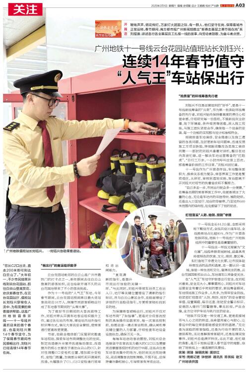 大年初一,不少市民搭乘环线到云台花园站,前往白云山登高赏花,欢庆新春佳节。在云台花园站厅,值班站长刘钰兴穿梭在人流中,为有需要的乘客提供帮助。
