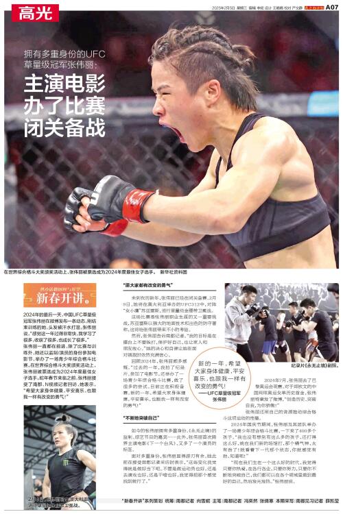 回顾2024年,张伟丽颇多感慨。“过去的一年,我拍了纪录片、参加了电影节,还举办了一场青少年综合格斗比赛,做了很多的尝试。目前正在积极备赛。新的一年,希望大家身体健康,平安喜乐,也跟我一样有改变的勇气!”