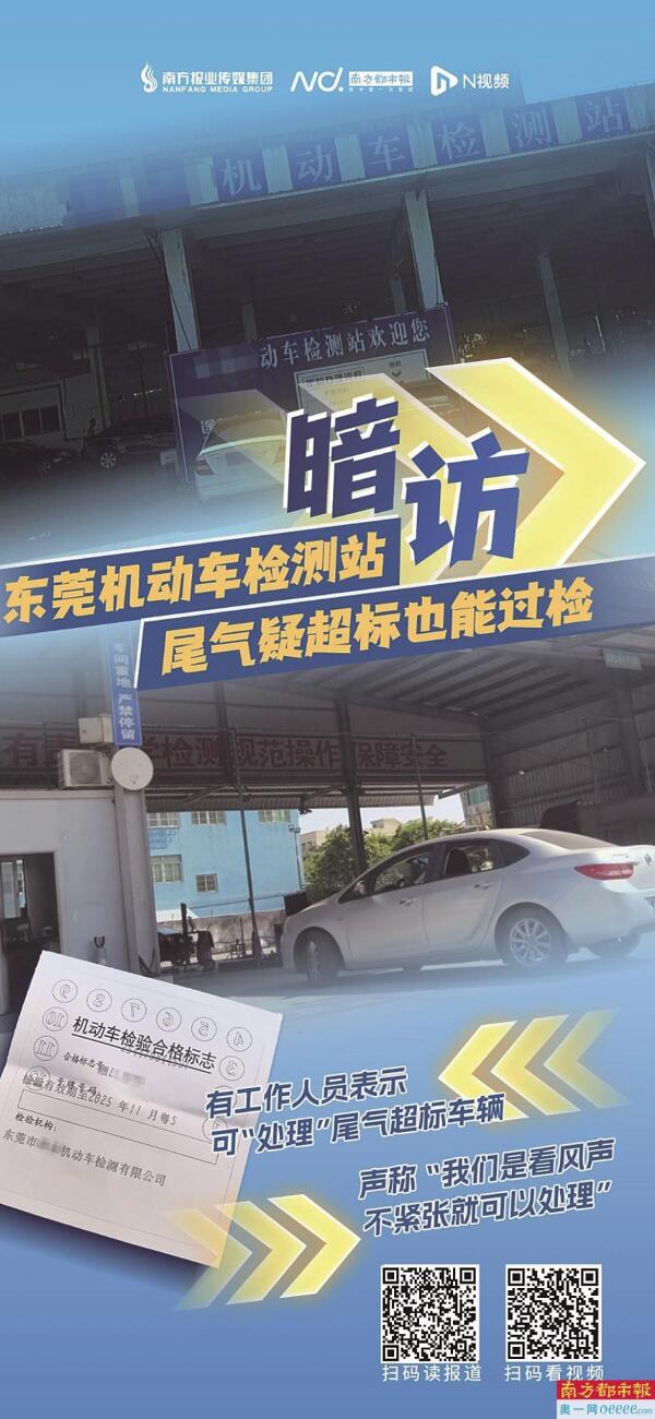 据了解,2024年12月11日,南都推出《暗访东莞机动车检测:尾气疑超标也能过检,“风声不紧就行”》报道(暗访东莞机动车检测站)。此前,在知情人的带领下,南都记者开展了持续一个月的暗访调查,亲身见证经知情人提前“打招呼”后,东莞市内多家检测站对尾气排放可能不达标的小轿车,出具了机动车检验合格标志。在此过程中,还有检测站工作人员直言,“我们是看风声,不紧张就可以处理(尾气排放不合格的问题车),一紧张就收一收。”