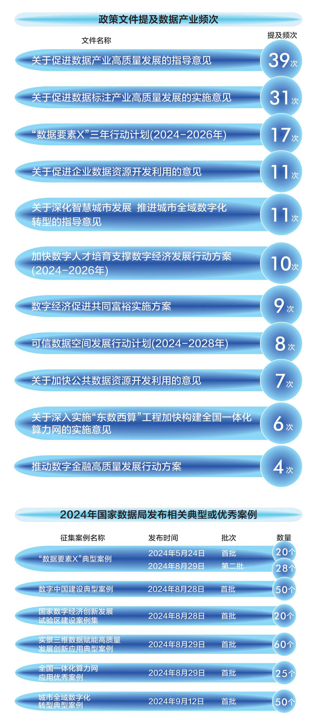 为此,国家数据局挂牌以来密集出台了多份数据产业相关政策文件。其中,《关于促进数据产业高质量发展的指导意见》从八个维度全面布局,包括加强数据产业规划布局、培育多元经营主体、加快数据技术创新、提高数据资源开发利用水平、发展数据流通交易、强化基础设施支撑、提高数据领域动态安全保障能力、优化产业发展环境等。而《关于促进企业数据资源开发利用的意见》《可信数据空间发展行动计划(2024—2028年)》等文件则明确重点推动数据产业与无人驾驶、具身智能、低空经济等数据密集型产业融合发展,加速数智融合技术创新,力求抢占数据产业发展先机。数据标注产业是对数据进行筛选、清洗、分类、注释、标记和质量检验等加工处理的新兴产业,国家发展改革委、国家数据局、财政部、人力资源社会保障部联合发布《关于促进数据标注产业高质量发展的实施意见》,统筹推进数据标注产业发展工作。