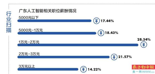 薪酬方面,人工智能行业的高薪区间职位比重较高。南都大数据研究院数据分析结果显示,广东地区超六成人工智能相关职位开出万元以上月薪,更有14.22%职位月薪在3万元以上。