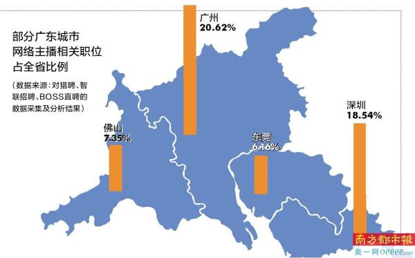南都大数据研究院留意到,致力打造直播电商之都的广州,正吸引大批企业和人才集聚。数据采集结果显示,广东省内20.62%的网络主播相关招聘信息来自广州。部分企业对主播的外语技能提出明确要求,月薪普遍在万元以上,旨在开拓跨境直播电商业务。也有不少企业招聘直播运营、数据分析师等幕后职位。