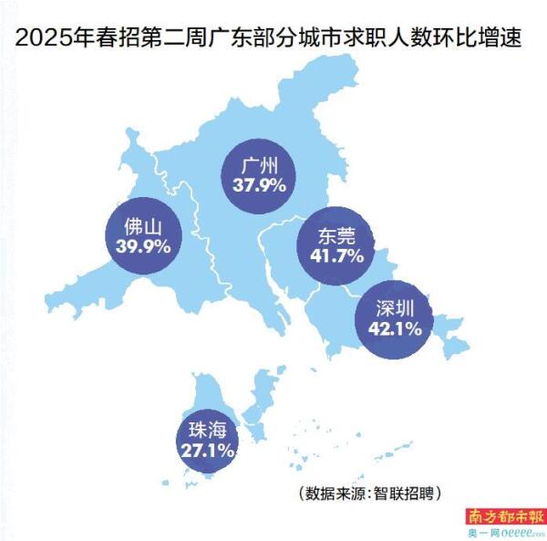 智联招聘平台数据则显示,春招第二周,求职人数环比增速TOP10城市榜单中,广东占据5席,其中深圳以42.1%的环比增速领跑全国,东莞、佛山、广州分列第二、三、四位,珠海也跻身榜单前九。