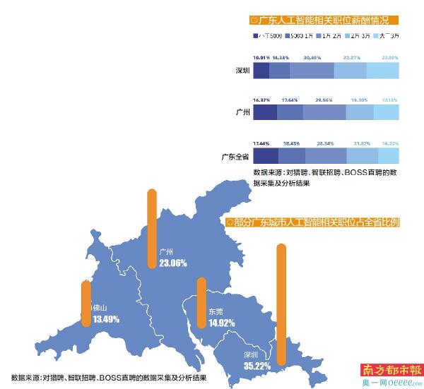 在需求侧,南都大数据研究院梳理分析猎聘、智联招聘、BOSS直聘的AI相关招聘岗位数据发现,省内35.22%的人工智能相关招聘信息来自深圳,23.05%来自广州。薪资区间也从几千到上百万元不等,展现了岗位需求的丰富性。