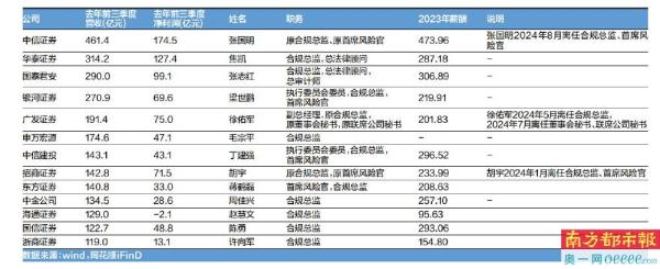 2024年前三季度,中信建投、国信证券分别实现营收143.1亿元、122.7亿元,营收在13家券商中排名第7、第12位,但两家公司合规总监薪酬居前——丁建强、陈勇2023年薪酬均接近300万元,分别以296.5万元、293.1万元位列第三、第四名。