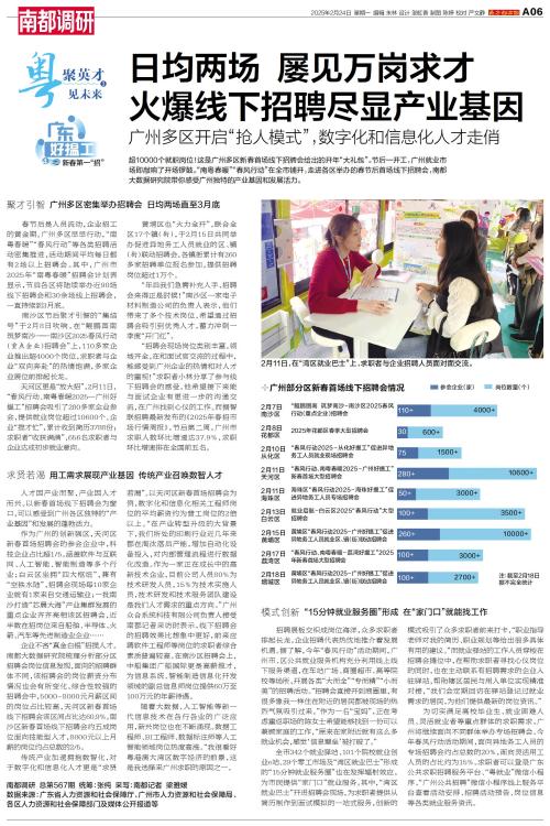 招聘展板交织成岗位海洋,众多求职者排起长龙,企业招聘代表热忱地推介着发展机遇。据了解,今年“春风行动”活动期间,广州市、区公共就业服务机构充分利用线上线下服务渠道,在车站广场、商圈超市、高等院校等场所,开展各类“大而全”“专而精”“小而美”的招聘活动。“招聘会直接开到商圈里,有很多像我一样住在附近的居民都被现场的热烈气氛吸引过来。”作为一名“宝妈”,正在考虑重返职场的陈女士希望能够找到一份可以兼顾家庭的工作,“原来在家附近就有这么多就业机会,感觉‘信息壁垒’被打破了。”