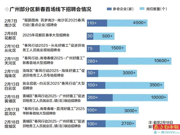 春节后是人员流动,企业招工的黄金期。广州多区早早行动,“南粤春暖”“春风行动”等各类招聘活动密集推进,活动期间平均每日都有2场以上招聘会。其中,广州市2025年“南粤春暖”招聘会计划表显示,节后各区将陆续举办近90场线下招聘会和30余场线上招聘会,一直持续到3月底。