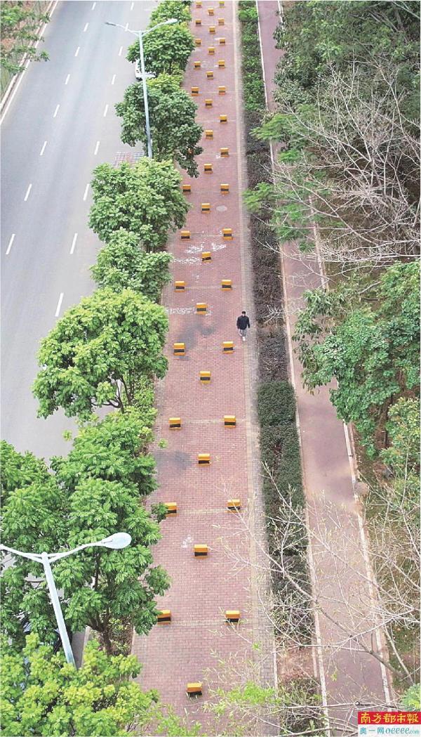 近日,广东酒店管理职业技术学院东门左侧的人行道上密密麻麻地被放置了诸多石墩,每排一个或两个规则地摆放,绵延上百米,对于途经的行人或者骑行者造成一定影响。