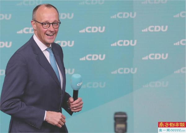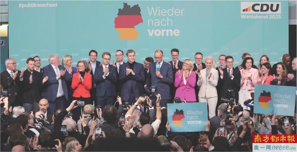 默茨(中)在出口民调显示领先后接受祝贺。 新华社发