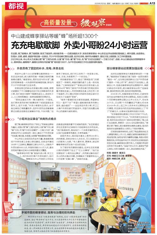目前,中山已建成包含党群服务中心、蜂享驿站、暖蜂商户、暖蜂社区等在内的暖“蜂”场所超1300个,为户外劳动者的工作生活提供便利服务。
