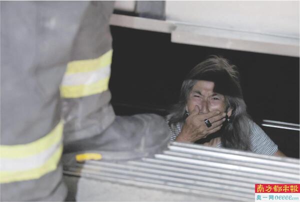 2月25日,在智利首都圣地亚哥,消防员营救一位因停电而被困在电梯里的老人。 新华社发