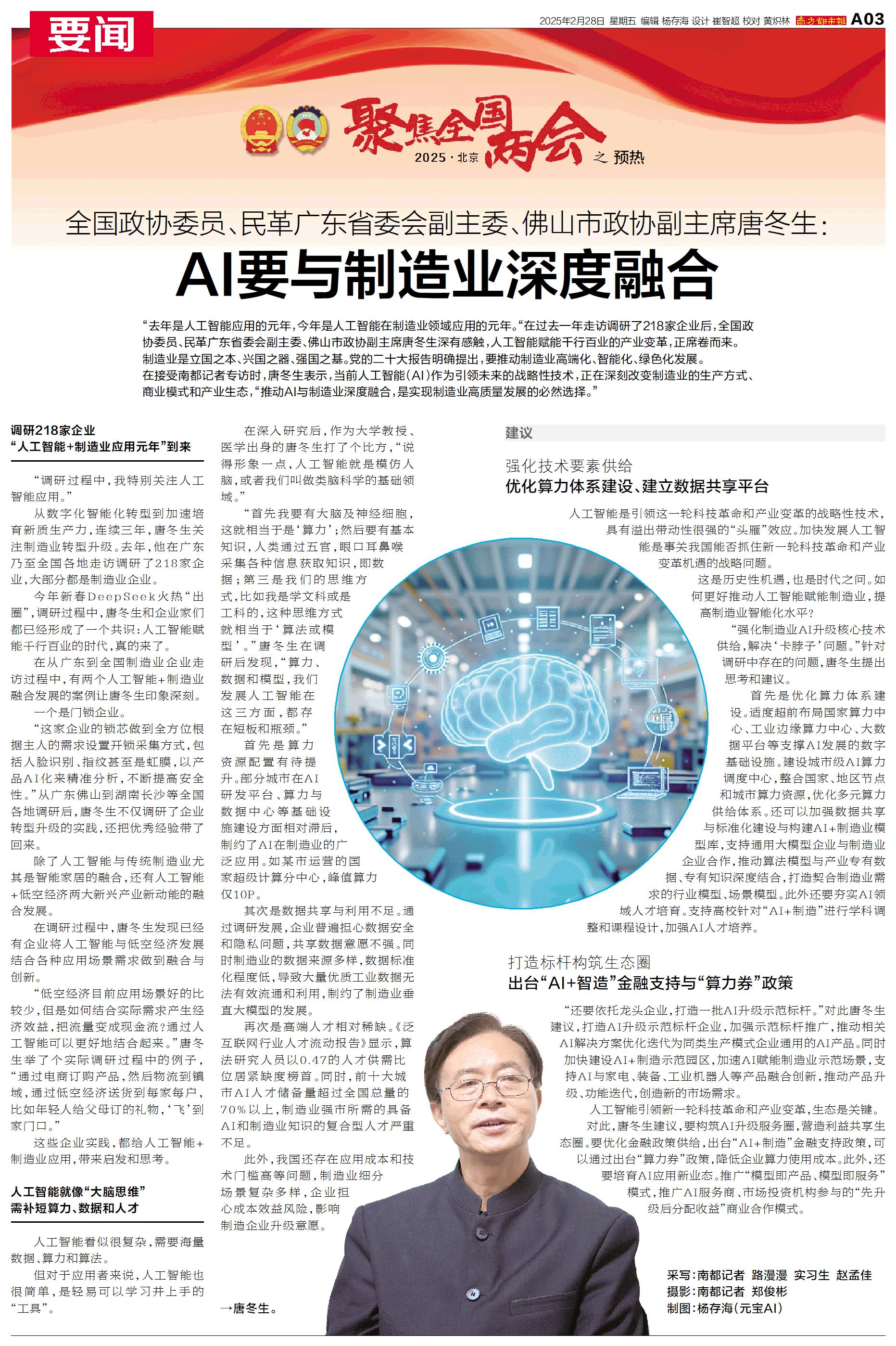 在接受南都记者专访时,唐冬生表示,当前人工智能(AI)作为引领未来的战略性技术,正在深刻改变制造业的生产方式、商业模式和产业生态,“推动AI与制造业深度融合,是实现制造业高质量发展的必然选择。”