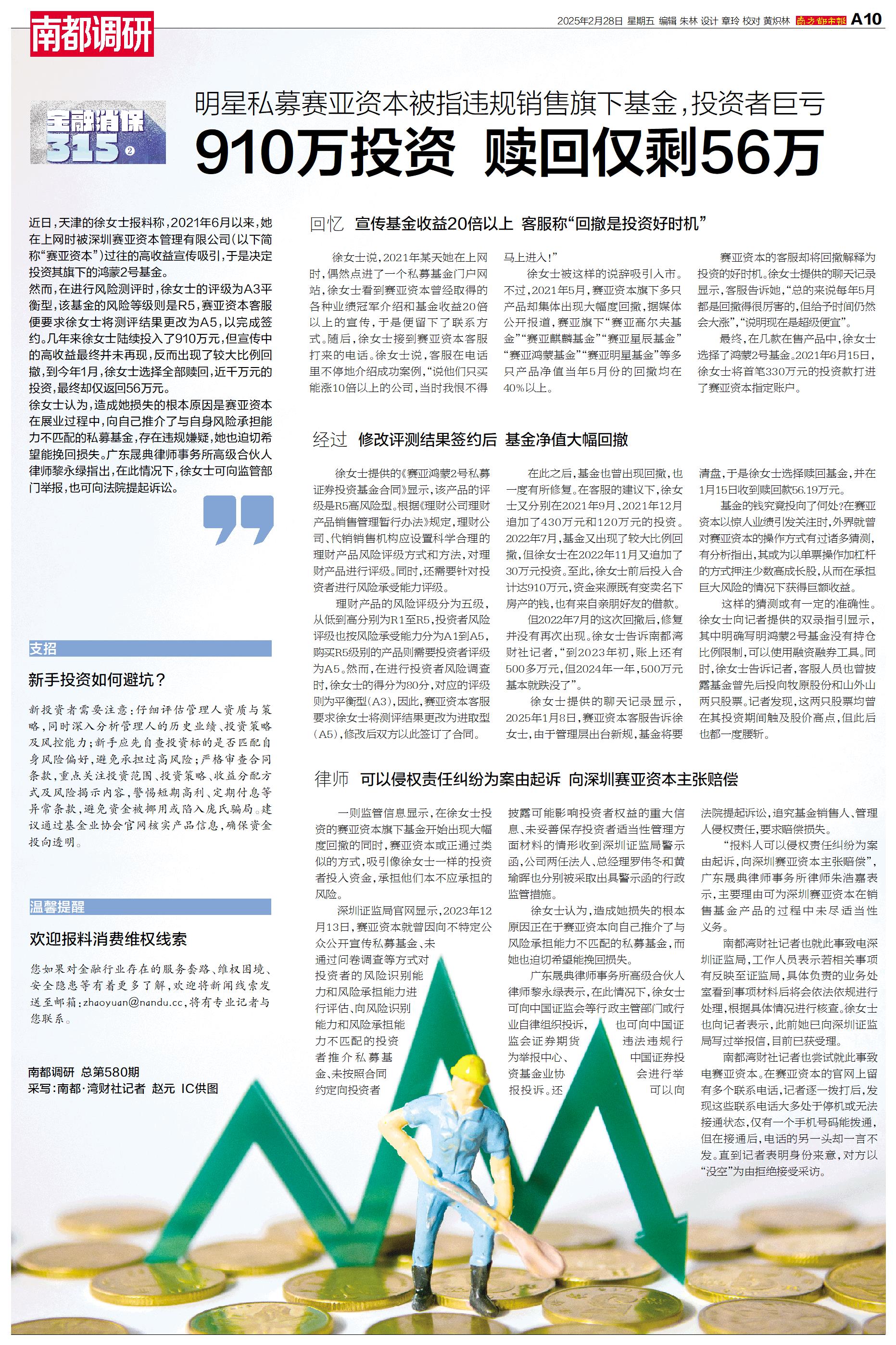 近日,天津的徐女士报料称,2021年6月以来,她在上网时被深圳赛亚资本管理有限公司(以下简称“赛亚资本”)过往的高收益宣传吸引,于是决定投资其旗下的鸿蒙2号基金。