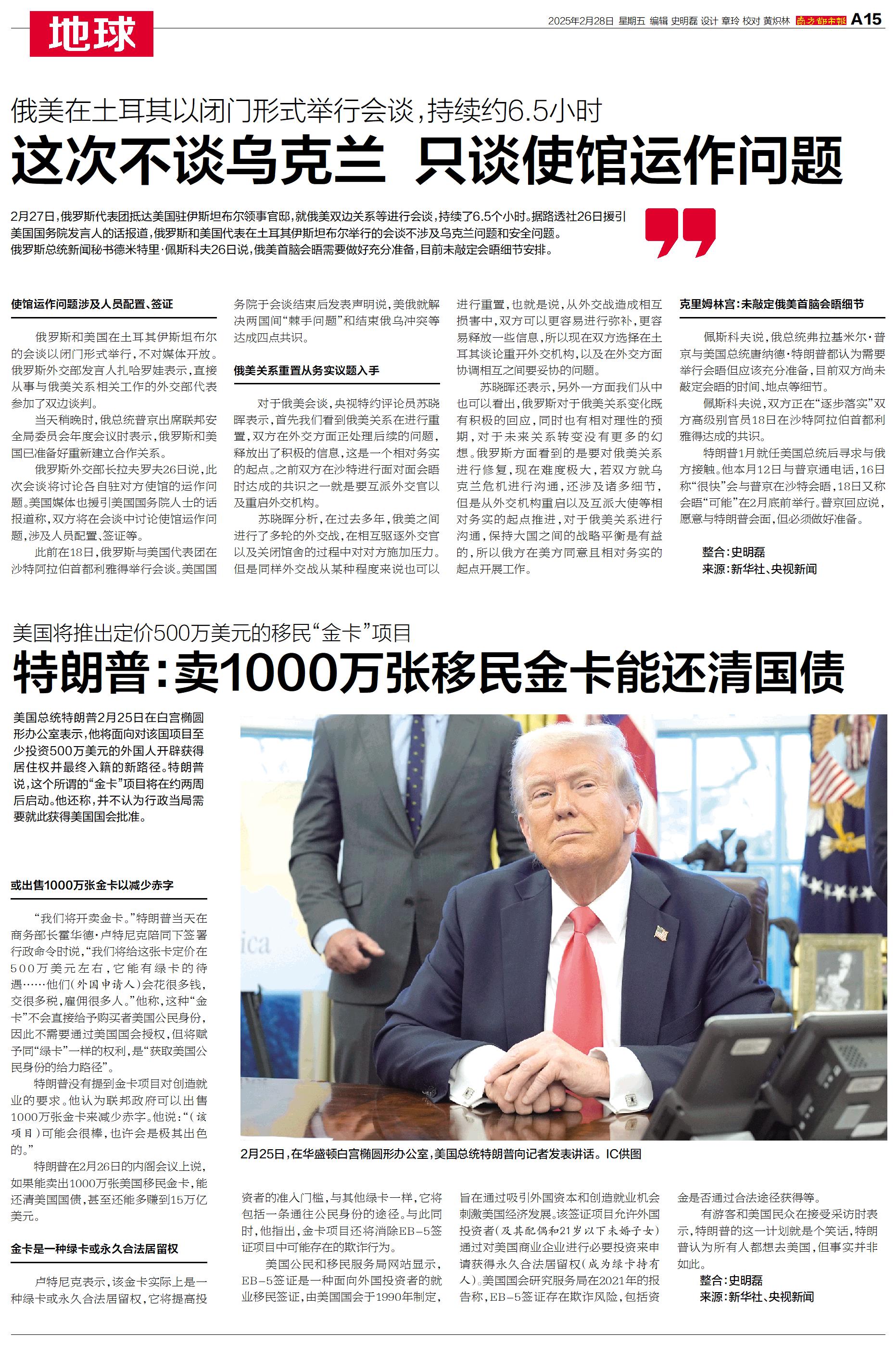 美国总统特朗普2月25日在白宫椭圆形办公室表示,他将面向对该国项目至少投资500万美元的外国人开辟获得居住权并最终入籍的新路径。