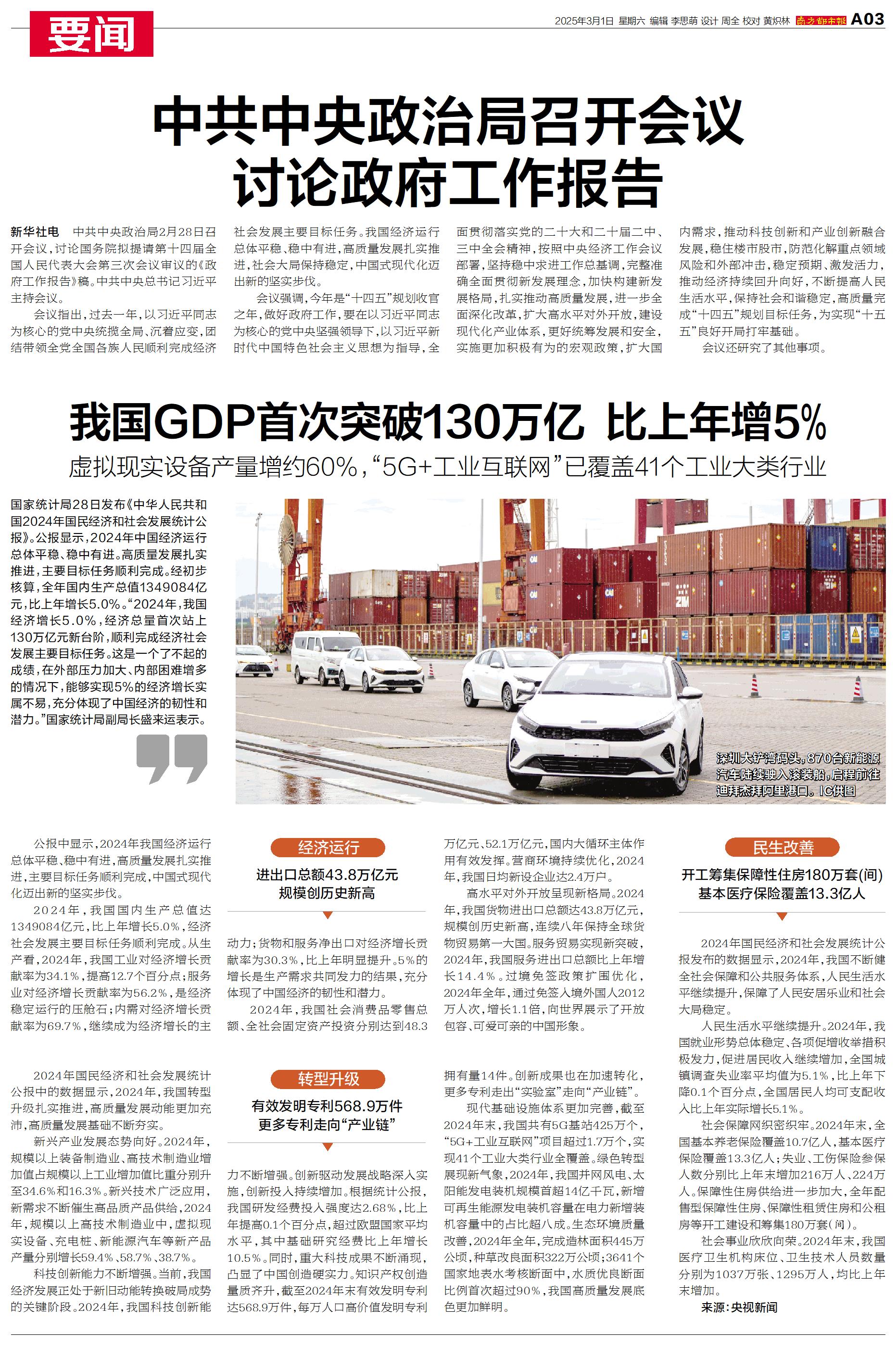 中共中央政治局2月28日召开会议,讨论国务院拟提请第十四届全国人民代表大会第三次会议审议的《政府工作报告》稿。