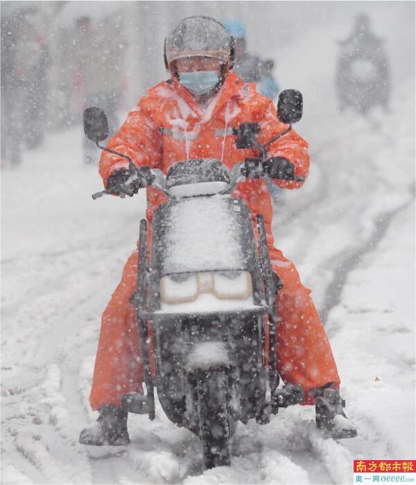 3月2日,山东省济南市街头,人们冒雪出行。 新华社发