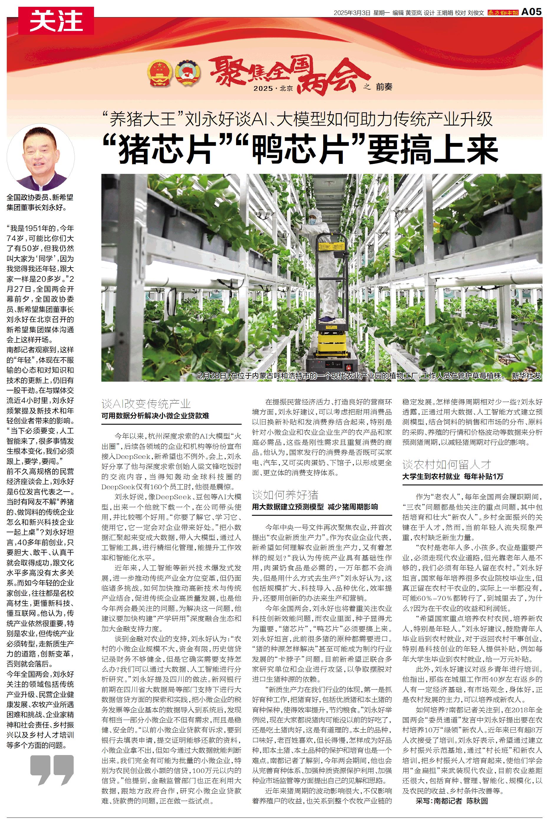 今年全国两会,刘永好关注的领域包括传统产业升级、民营企业健康发展、农牧产业所遇困难和挑战、企业家精神和社会责任、乡村振兴以及乡村人才培训等多个方面的问题。