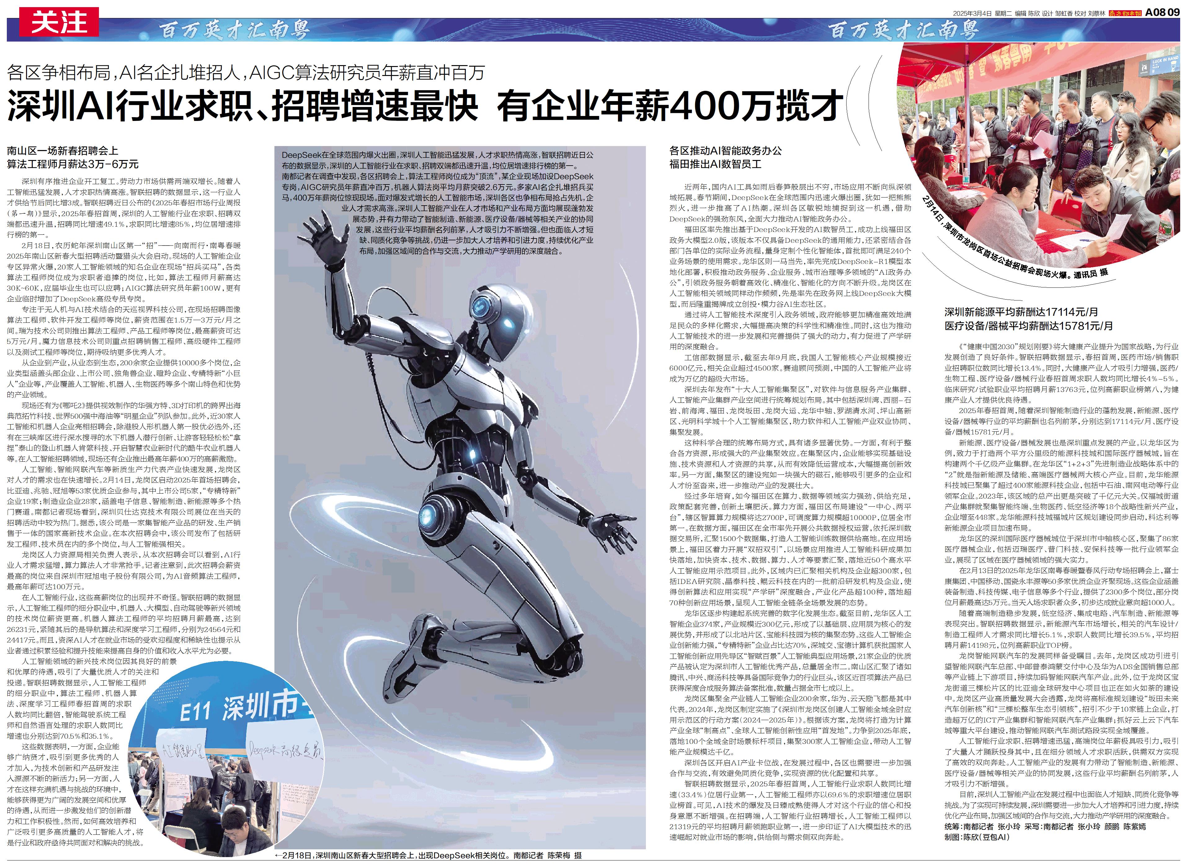 深圳AI行业求职、招聘增速最快 有企业年薪400万揽才