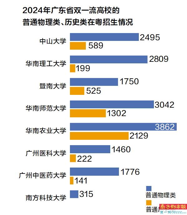 以2024年广东省双一流高校的招生情况为例,中山大学普通物理类在粤招生2495人,普通历史类招生589人;华南理工大学普通物理类2809人,普通历史类199人;暨南大学普通物理类1750人,普通历史类525人;华南师范大学普通物理类3173人,普通历史类1302人;华南农业大学普通物理类3862人,普通历史类2129人;广州医科大学普通物理类1460人,普通历史类222人;广州中医药大学普通物理类1776人,普通历史类141人;南方科技大学普通物理类315人。
