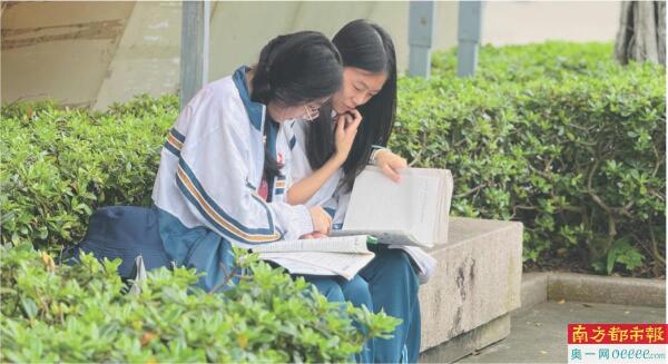 高中生要“双休”还是“单休”?部分高中生和家长对此问题感到纠结又矛盾。但人们都认同,孩子们应劳逸结合。图为2024年高考期间,汕头市金山中学考场外,考前复习的考生们。 南都记者 李佳滢 摄
