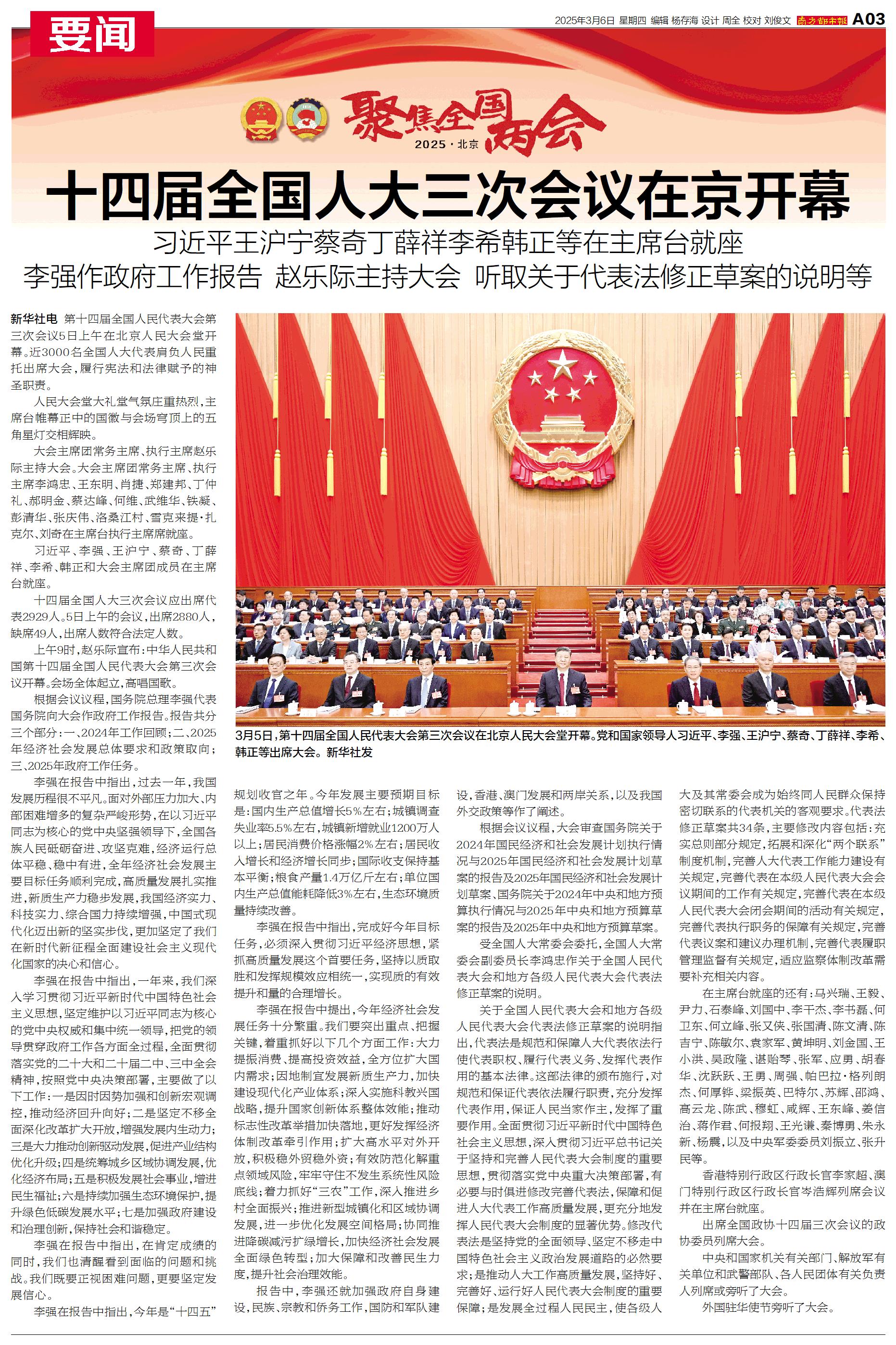 第十四届全国人民代表大会第三次会议5日上午在北京人民大会堂开幕。