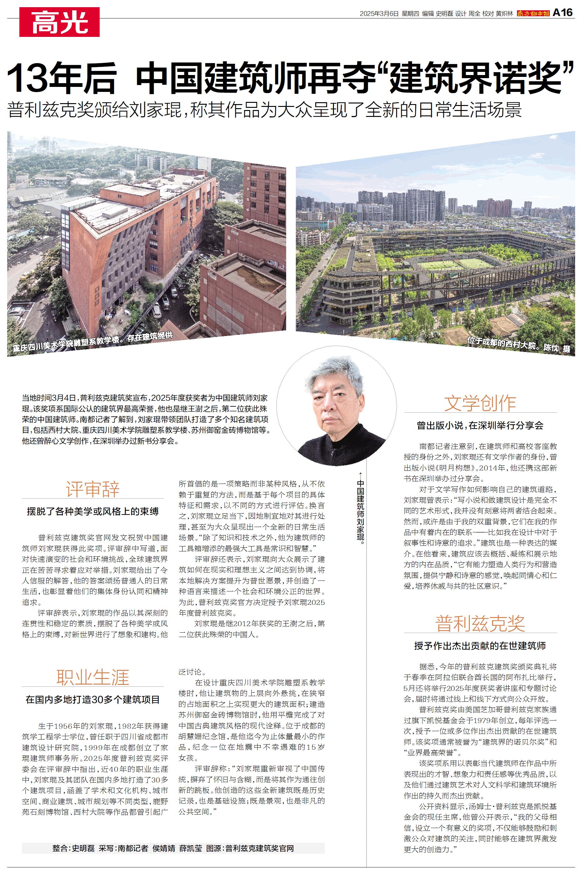 当地时间3月4日,普利兹克建筑奖宣布,2025年度获奖者为中国建筑师刘家琨。