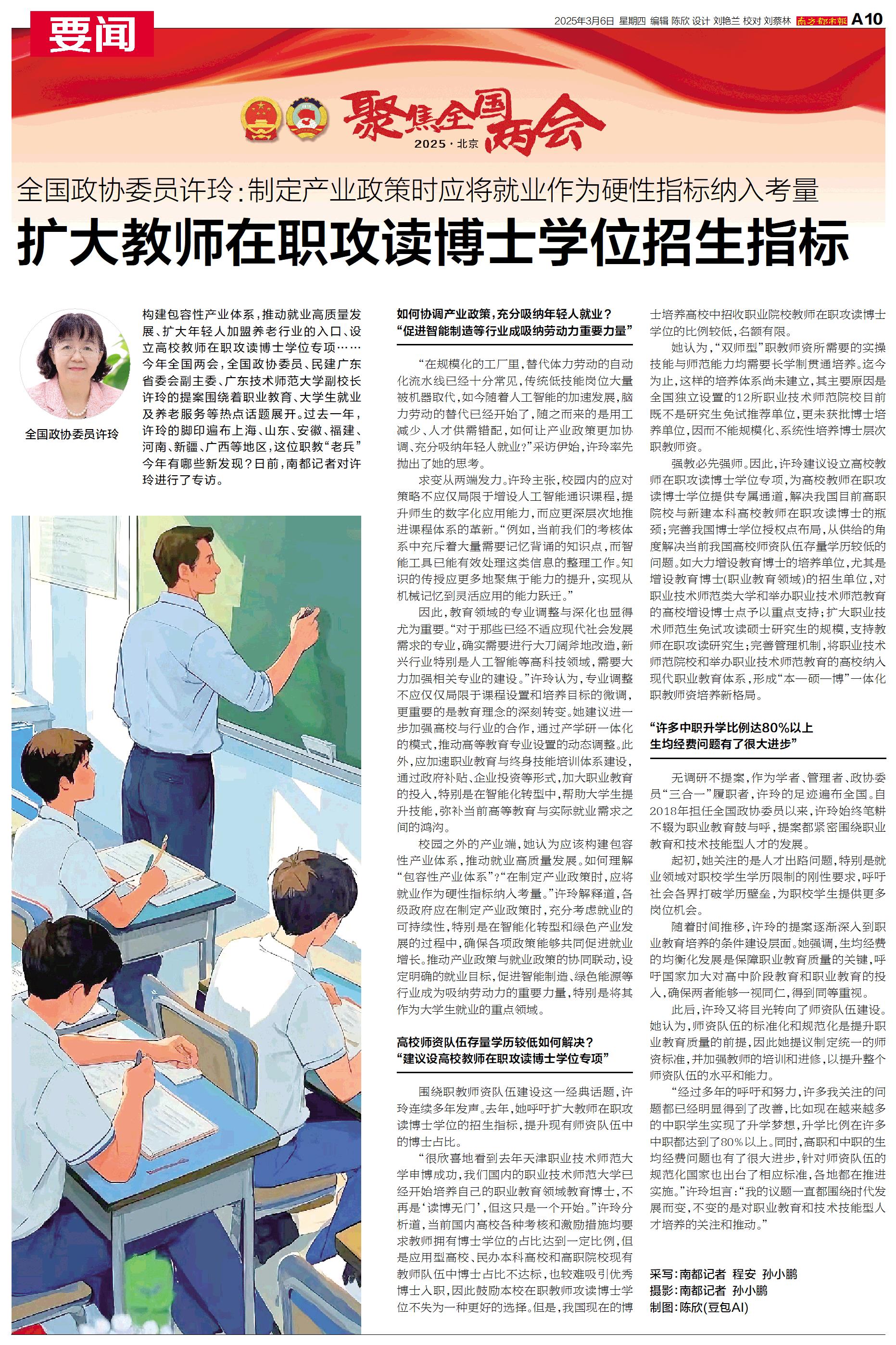 今年全国两会,全国政协委员、民建广东省委会副主委、广东技术师范大学副校长许玲的提案围绕着职业教育、大学生就业及养老服务等热点话题展开。