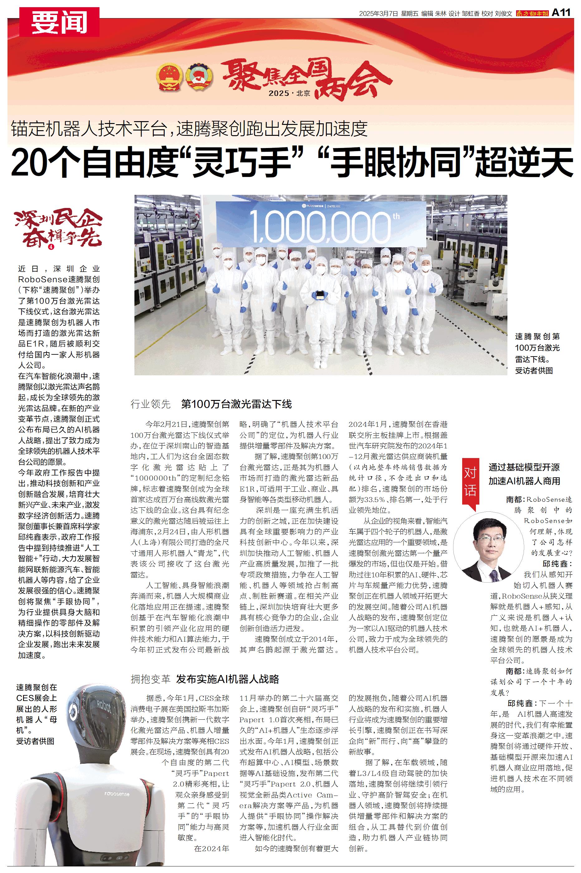 近日,深圳企业RoboSense速腾聚创(下称“速腾聚创”)举办了第100万台激光雷达下线仪式,这台激光雷达是速腾聚创为机器人市场而打造的激光雷达新品E1R,随后被顺利交付给国内一家人形机器人公司。