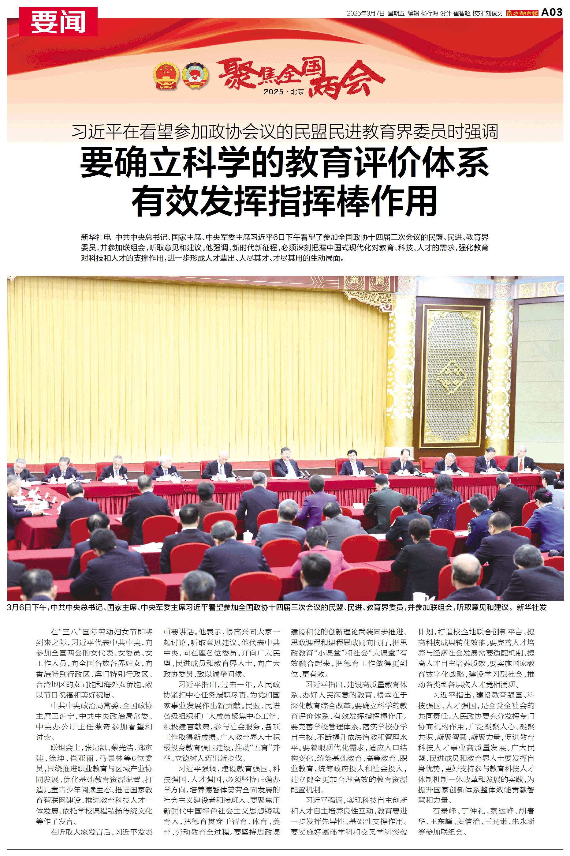 中共中央总书记、国家主席、中央军委主席习近平6日下午看望了参加全国政协十四届三次会议的民盟、民进、教育界委员,并参加联组会,听取意见和建议。