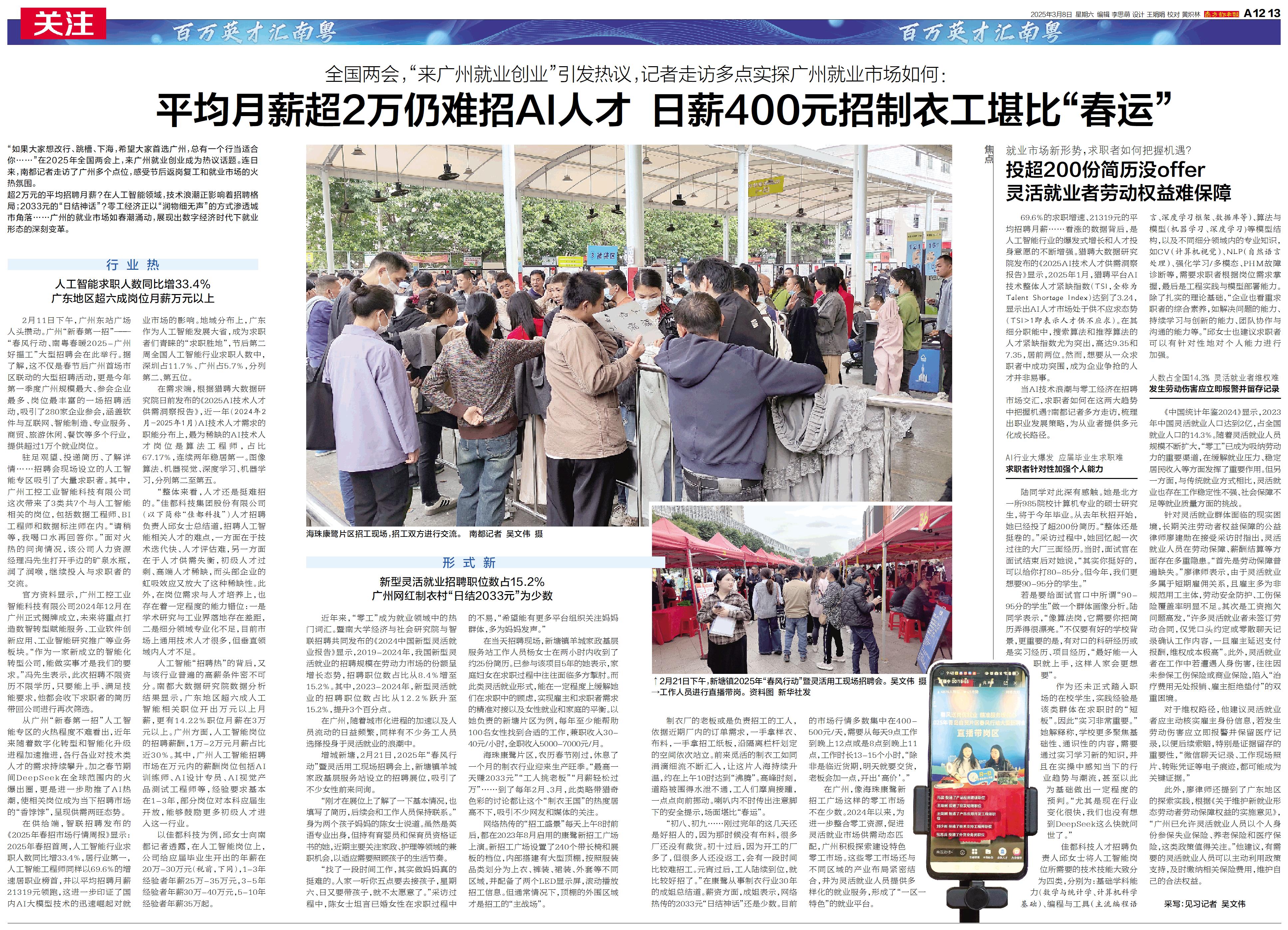 超2万元的平均招聘月薪?在人工智能领域,技术浪潮正影响着招聘格局;2033元的“日结神话”?零工经济正以“润物细无声”的方式渗透城市角落……广州的就业市场如春潮涌动,展现出数字经济时代下就业形态的深刻变革。