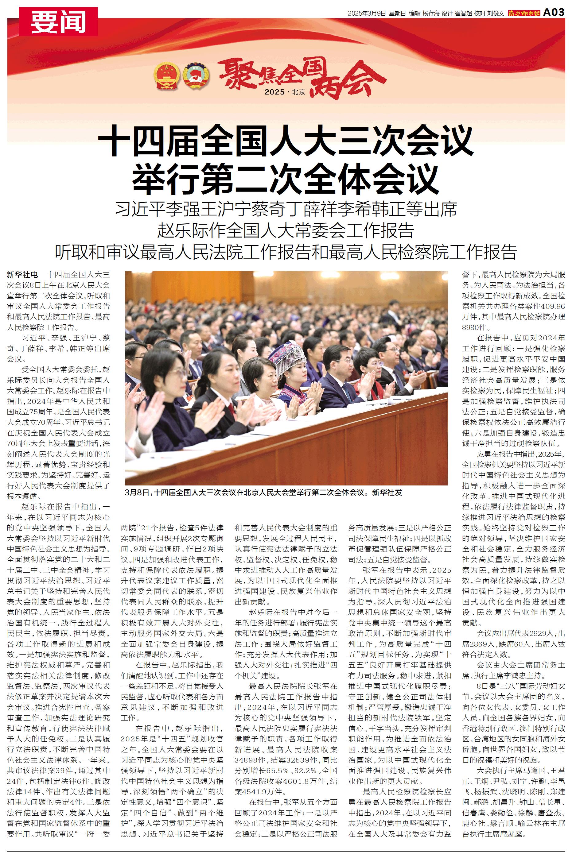 十四届全国人大三次会议8日上午在北京人民大会堂举行第二次全体会议,听取和审议全国人大常委会工作报告和最高人民法院工作报告、最高人民检察院工作报告。
