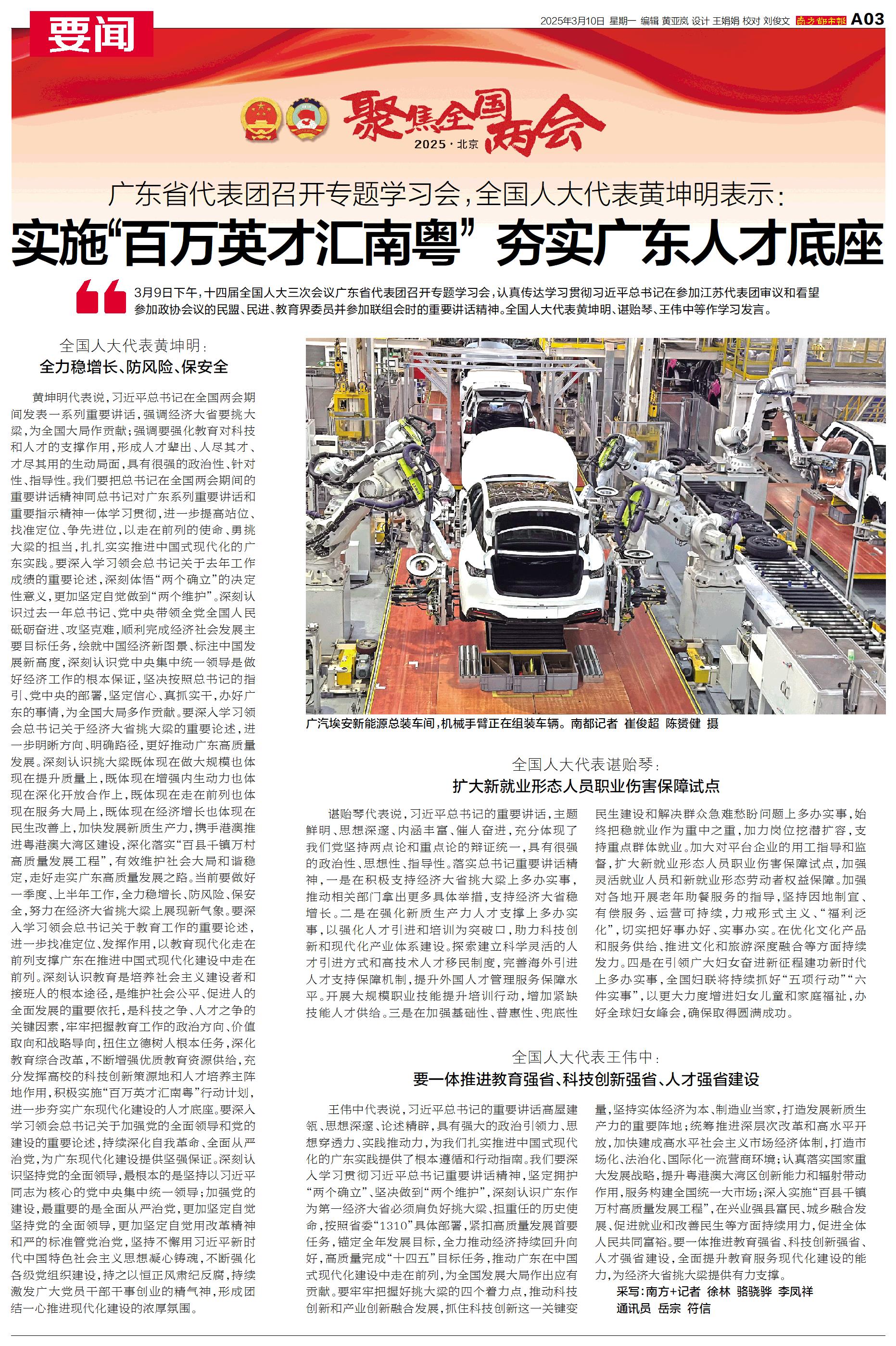3月9日下午,十四届全国人大三次会议广东省代表团召开专题学习会。